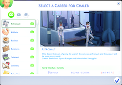 АстронавтОсновная работа космонавта - изучение космоса, естественно. Начальные ступени карьеры в основном подготавливают будущего астронавта. По мере продвижения, вашему симу нужно будет строить и улучшать ракеты. И в завершении - отправиться в космос для удовлетворения своих амбиций. После достижения нужного уровня сим может полететь "на выезд" на планету Сиксам. В зависимости от выбора карьерной ветки, вашему симу придется выполнять разную работу, Рейнджеры должны будут вступить в контакт с инопланетными формами жизни, а контрбандисты должны будут собирать коллекции и делать нужные фотографии.