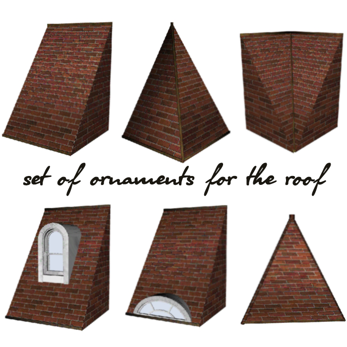 По заказу Susie_Rose, крыши из The Sims 2 Переезд в квартиру. Пока что рабочий вариант, позже еще вернусь и сделаю вогнутые. Жду ваших комментариев и замечаний! Говорите, что нужно переделать, изменить, что не получилось и что надо добавить! Я вот, например, не придумала какими сделать края, поэтому там просто перекрашиваемая полоса, может сделать какой-нибудь бортик? С текстурами на границах элементов небольшой косяк, но пока что я не могу понять, как их выровнять. Также попытаюсь потом сделать элементы с окнами, когда разберусь с ними )))