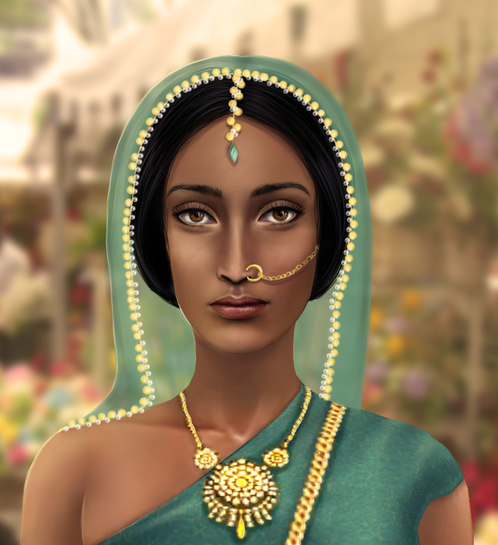 Работа над лицом да и вообще над образом проделана колоссальная. И взгляд такой получился, даже не знаю как его описать... живой, настоящий, в глазах девушки будто отражены все ее чувства, вся ее история, судьба. А сари впечатляет своими деталями, великолепно получилось