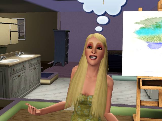 Ну и на конец, я увидела то, чего никогда не видела... Сим сел на плитку и стал играть в ноут 0_о Я такого никогда не видела в симсе.