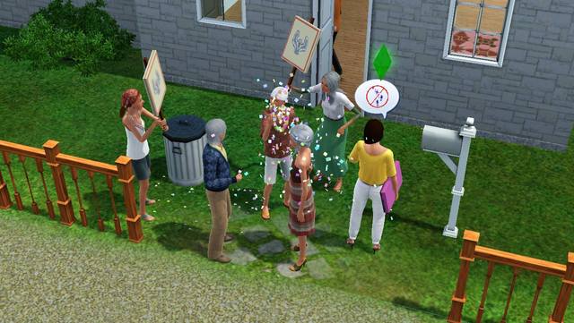 И еще один забавный случай. Я пожилых персонажей всегда всех вместе отселяю в отдельный дом, где они мирно проводят последние свои дни. А сама играю другой семьей. И решила я проверить чем же они там занимаются в свободное время, а они целыми днями устраивают протестные акции, и шум от них на весь район,видимо бунтуют против нелегкой жизни пенсионеров:)