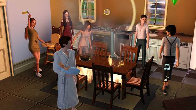 Благо все закончилось хорошо, огонь потушили, симы стали расходиться. Я успокоилась и вернулась обратно к своим персонажам. Вы думаете, игра позволила мне расслабиться? Примерно через пару часов я снова получила оповещение о пожаре. Не знаю, может камин в тот раз не потушили, а может какой-то мазохист его снова зажег, но камин вновь стал гореть. И вновь вокруг него столпились симы. И вновь приехал пожарный, который не мог полтора часа добраться до огня. Я тупо перемотала игру до того момента, когда все закончилось, потому что мне это уже надоело.