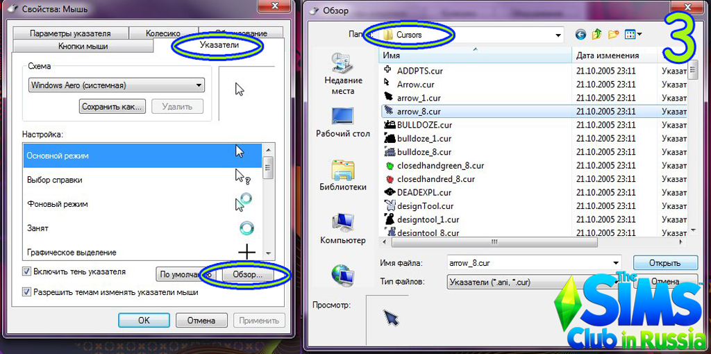 В появившемся окне выбираем вкладку указатели. Выбираем курсор, который хотим заменить. Нажимаем обзор.