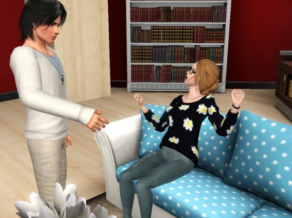 А в это время Элиза сидела под диваном, зажав уши ладонями. Мэтью подошел к ней.