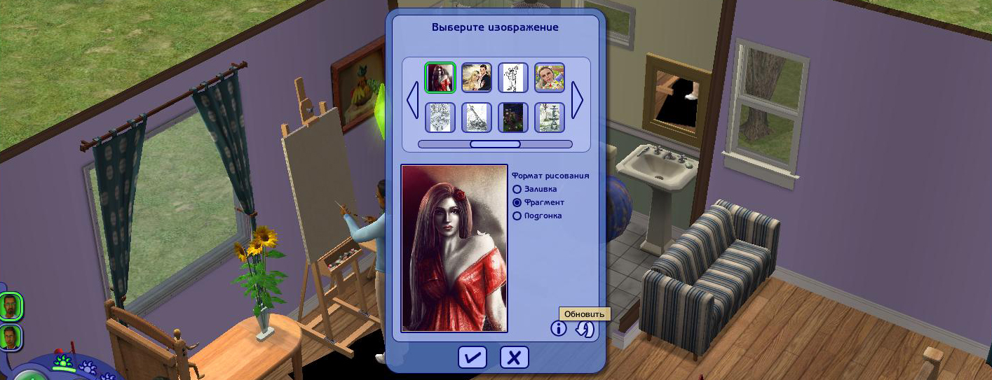 В The Sims 2 можно нарисовать картину из любой картинки, которую вы загрузите в игру. Опция «Нарисовать собственную картину» становится доступна симам при достижении пятого уровня навыка «Творчество».