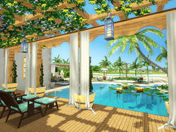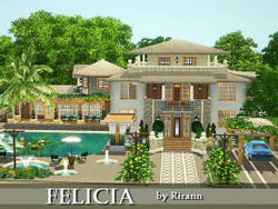 Небольшая вилла:прихожая-холл,ванная,столовая и кухня,гостиная,большая спальня хозяйки с большим балконом во внутренний дворик,гостевая,комната для дворецкого,ванная с камином.Во внутреннем дворике(выход из кухни и из гостиной) большой бассейн,беседка для барбекю-всё это в окружении цветов и кустарников.....
