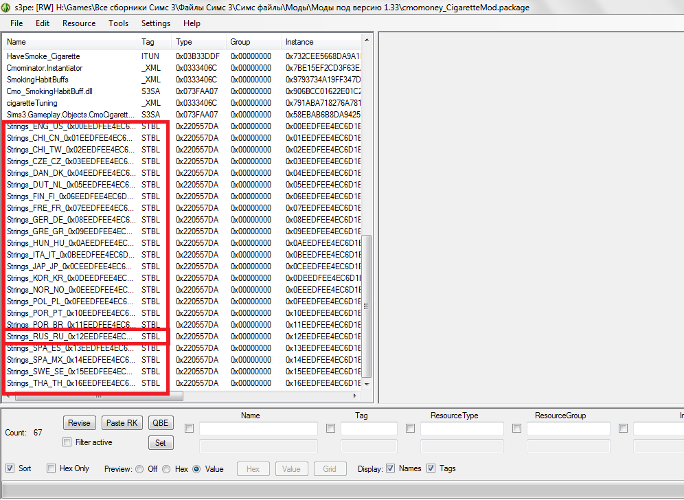 Внизу вы увидите список файлов, которые входят в этот мод. Нас интересуют лишь файлы с расширением STBL. Это языковые файлы, они отвечают за перевод.
