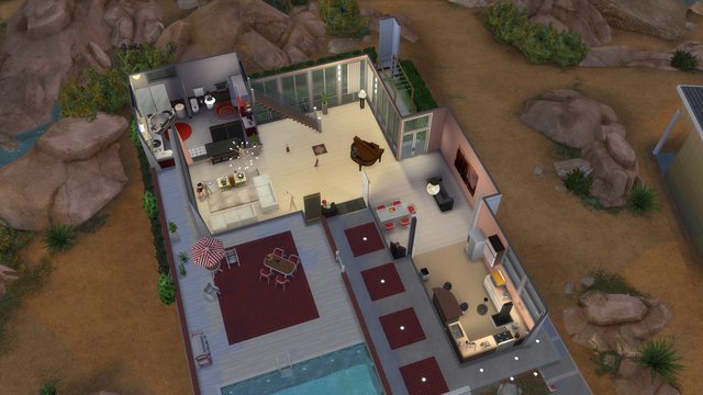 Тип лота - жилой дом, создан не позже дополнения "На работу", мне кажется, он вообще был из базовой игры. Красный акцент в облицовке и интерьере, три этажа, бассейн, спортзал, угловая ванная, небольшая игровая площадка сбоку. Всего три спальни (они все на самом верхнем этаже) и четыре ванных комнаты. Картинки каким дом был и какой есть сейчас под катом. Если кто найдёт этот дом, буду безумно благодарна!