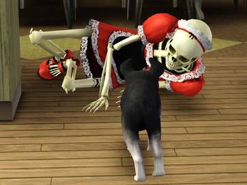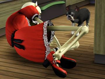 Приобрела своим симам Скелехильду, и как-то немного разочарована. За детьми она не очень чтоб следит(у симов близнецы, маленькие ещё), только когда они совсем разорутся, подходит. Ещё она подходит к холодильнику, достаёт какую-нибудь бесплатную еду, типа рагу из мозгов, ставит рядом на тумбу, а потом сразу убирает обратно. Зачем она это делает, непонятно.