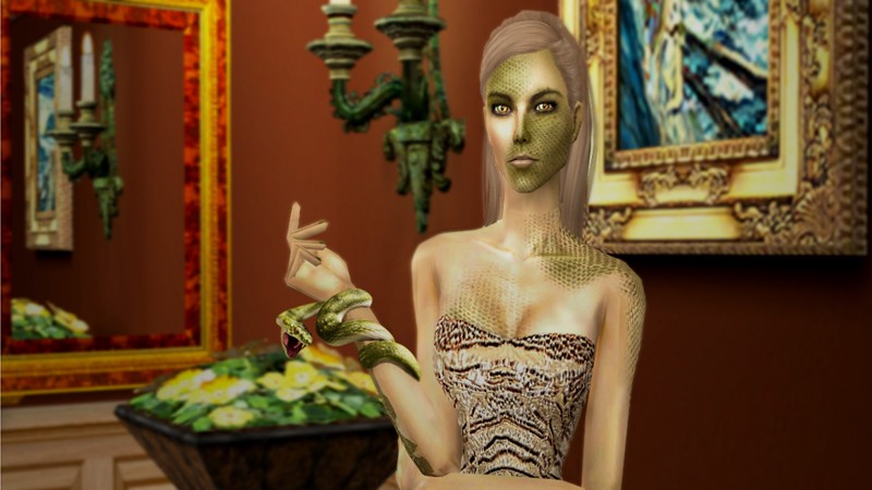 Вот тут я наоборот расстроилась, когда получила задание, потому что змей ненавижу и очень боюсь. Сначала я сделала одну девушку, но решила, что ей бы более змеиный скинтон, нашла скинтон , а как изменить не знаю хД пришлось создавать симку заново, получилось более змеино чем в первый раз)
