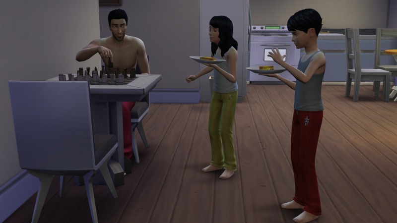 А я просто балдею сейчас от того, как сим может одновременно есть и пить, да еще и музыку слушать или телевизор смотреть, да еще и разговаривать с кем-то! Особенно мне нравится, как смотрятся стаканчики рядом с тарелками - а то в сим3 вечно в сухомятку давились.