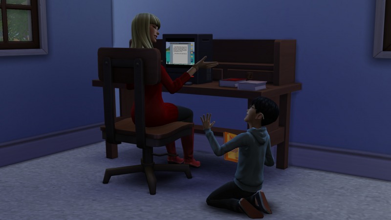 Создала семью: маму, папу и двух детей. Очень хотелось на мелких посмотреть. Они у меня теперь из дома не выходят, только в школу и на работу, так интересно наблюдать, как они общаются. Едят и общаются, смотрят телек и болтают, работают/учатся и опять болтают.