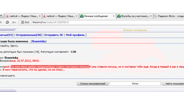 flowerinka, Vainona, Пользователь, похоже, слегка промахнулся. В его скрине письмо от flowerinka с минусом. И этот минус у него есть в репутации и в нем совершенно другой комментарий, без этого предложения с матами. А так как flowerinka не является администрацией и не может изменить свой посланный комментарий, то само собой напрашивается один вариант - подделка картинки в фотошопе. Т.е. получается, что пользователь занимается еще и подставой других людей. Как некрасиво ...